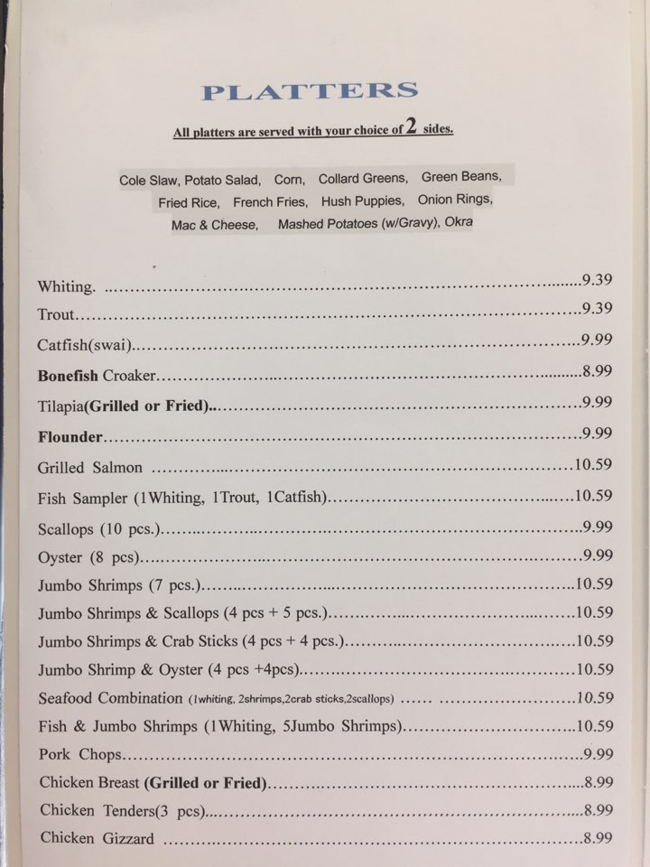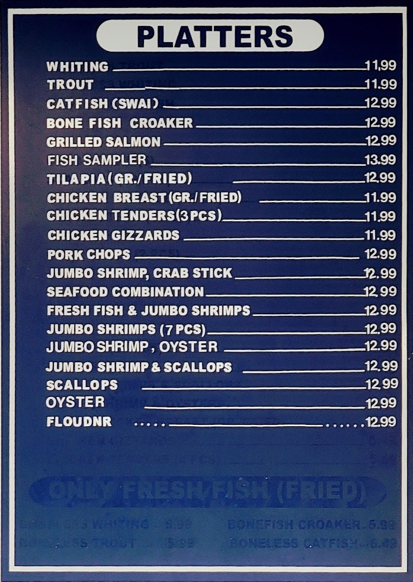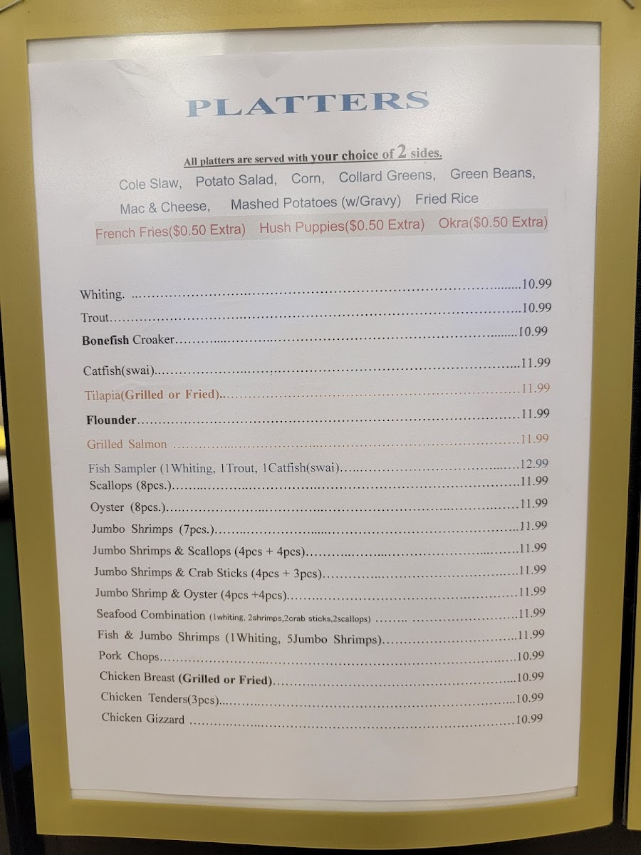 I work in the area and had a longing for fried fish. I am glad that I found Dave's. My go to order is the whiting platter with a double side order of hush puppies. The fish is crispy on the outside and moist and tender on the inside. The hush puppies are no joke. I have become a regular.